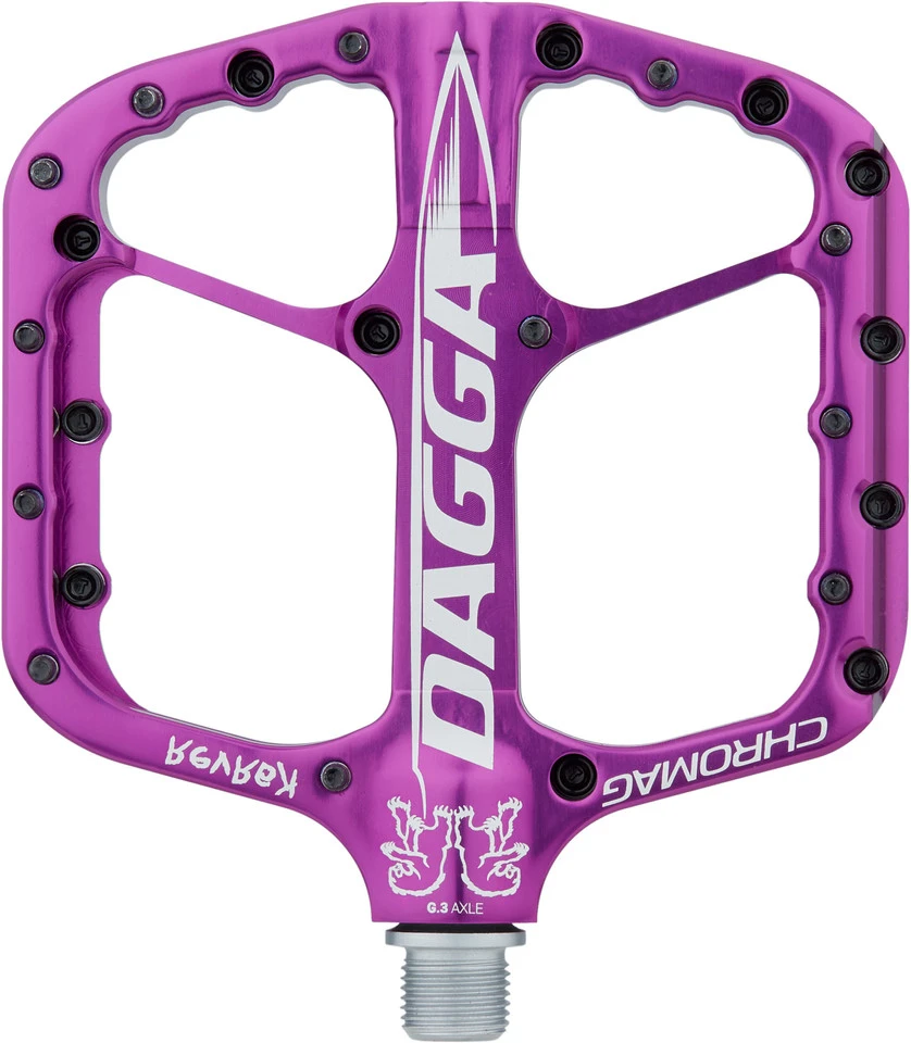 Spezifikationen:Einsatzbereich:DownhillAusführung:PlattformpedaleTechnische Daten:Material Pedalkörper:Aluminium (6061)Material Achse:Stahl (CrMo)Bauhöhe:14,3 mm (ohne Pinhöhe)Maße [L x B]:120 x 115 mmAnzahl Pins:24Features:konkaves Design, 14,3 mm Dicke in der PedalmitteCNC-gefrästes Aluminium24 höhenverstellbare PinsHerstellernummern:black:180-002-01blue:180-002-02red:180-002-04silver:180-002-05purple:180-002-03Lieferumfang:1 Paar Plattformpedale Chromag Dagga