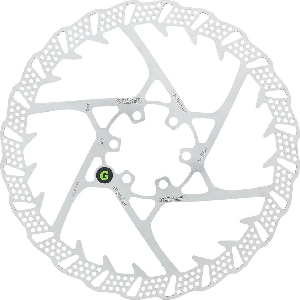 Technische Daten:Montage:6-LochDurchmesser:180 mm, 203 mm, 223 mmBauart:1-teiligMaterial Disc:EdelstahlFeatures:2 mm dicke, leichte MTB-Bremsscheibe mit 6-Loch-BefestigungWorldcup-bewährtlasergeschnitten, einteilige Fertigungstarke Bremspower auch bei Hitzeentwicklungsehr temperaturstabilverhältnismäßig geringer Kraftaufwand beim Bremsen nötigverhältnismäßig geringer Bremsbelagverschleißmit Korrosionsschutzmit Aussparung für E-Bike-Magnethergestellt in SpanienHerstellernummern:180 mm:DB023W203 mm:DB024W223 mm:DB027WLieferumfang:1 x Bremsscheibe GALFER Shark MTB 6-Loch6 x Schraube