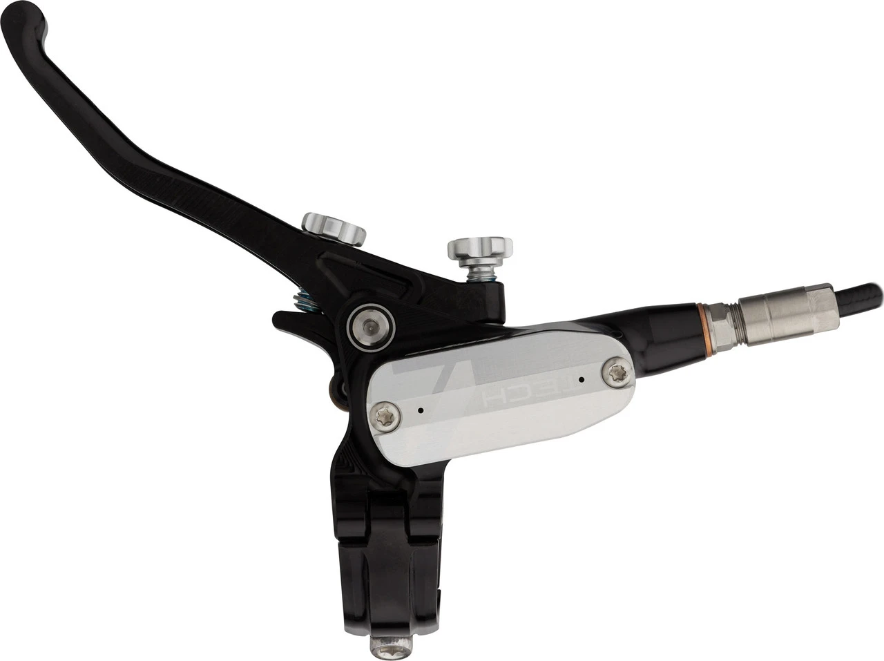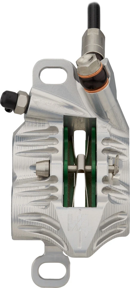 Spezifikationen:Einsatzbereich:Downhill, Dirtjump & SlopestyleBremsentyp:hydraulisch, 4-KolbenBremsmedium:DOT 5.1Leitung:KunststoffLeitungslänge VR/HR:1600 mmTechnische Daten Bremssattel:Montage Bremssattel:PostmountBremsbelag:Racing Organic Grade ResinBauweise:einteiligMaterial Bremssattel:AluminiumMaterial Kolben:Edelstahl, PhenolLeitungsanschluss:BanjoTechnische Daten Bremsgriff:Hebellänge:1-FingerEinstelloptionen:Griffweiteneinstellung, DruckpunktMontage:Klemmschelle (geteilt)Bauart:rechts (seitenspezifisch), links (seitenspezifisch)Material Bremshebel:AluminiumMaterial Bremsgriffgehäuse:AluminiumLeitungsanschluss:GeradeFeatures:hohe Bremspower für Bremsscheiben mit bis zu 220 mm DurchmesserPhenol-Einsätze in den Kolben und Kühlrippen am Sattel verhindern Überhitzungweiterentwickelte Technik mit deutlich mehr Druck verglichen mit Tech 3CNC-gefräster einteiliger BremssattelRollenlagerung im Hebelmechanismus verringert ReibungDruckpunkt und Hebelweite werkzeugfrei jederzeit anpassbarergonomische Hebelform für besseren Grip und weniger Ermüdungserscheinungenverstellbarer Hebelwinkelgeteilte Klemmschellekürzbare KunststoffleitungHinweis des Herstellers:Der V4 Bremssattel ist aufgrund seiner Bauweise