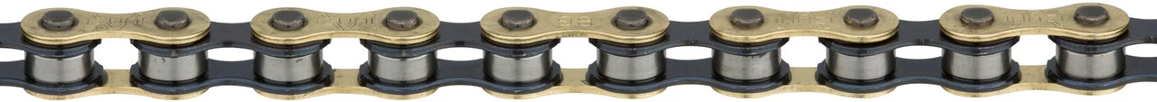 Die Izumi-V Super Toughness Kette 1-fach 1/2″ x 1/8″ von IZUMI ist eine der stärksten, langlebigsten und schönsten, gefertigt aus purem japanischem Stahl. Für die Pins nutzen IZUMI eine kohlenstoffreiche Legierung, die oft in reibungsarmen Kugellagern eingesetzt wird und die Haltbarkeit im Vergleich zu einer normalen Kette um 300 % erhöht. Die Kette ist von der NJS für Keirin-Rennen zugelassen und erfüllt damit strenge Kriterien. Professionelle Keirin-Fahrerinnen und -Fahrer schätzen sie aufgrund ihrer Stärke und effizienten Kraftübertragung. Die eigens entwickelte Oberflächenbehandlung erhöht die Verschleißfestigkeit. Goldene Außenlaschen vor mitternachtsblauen Innenlaschen sorgen für einen eindrucksvollen Kontrast.