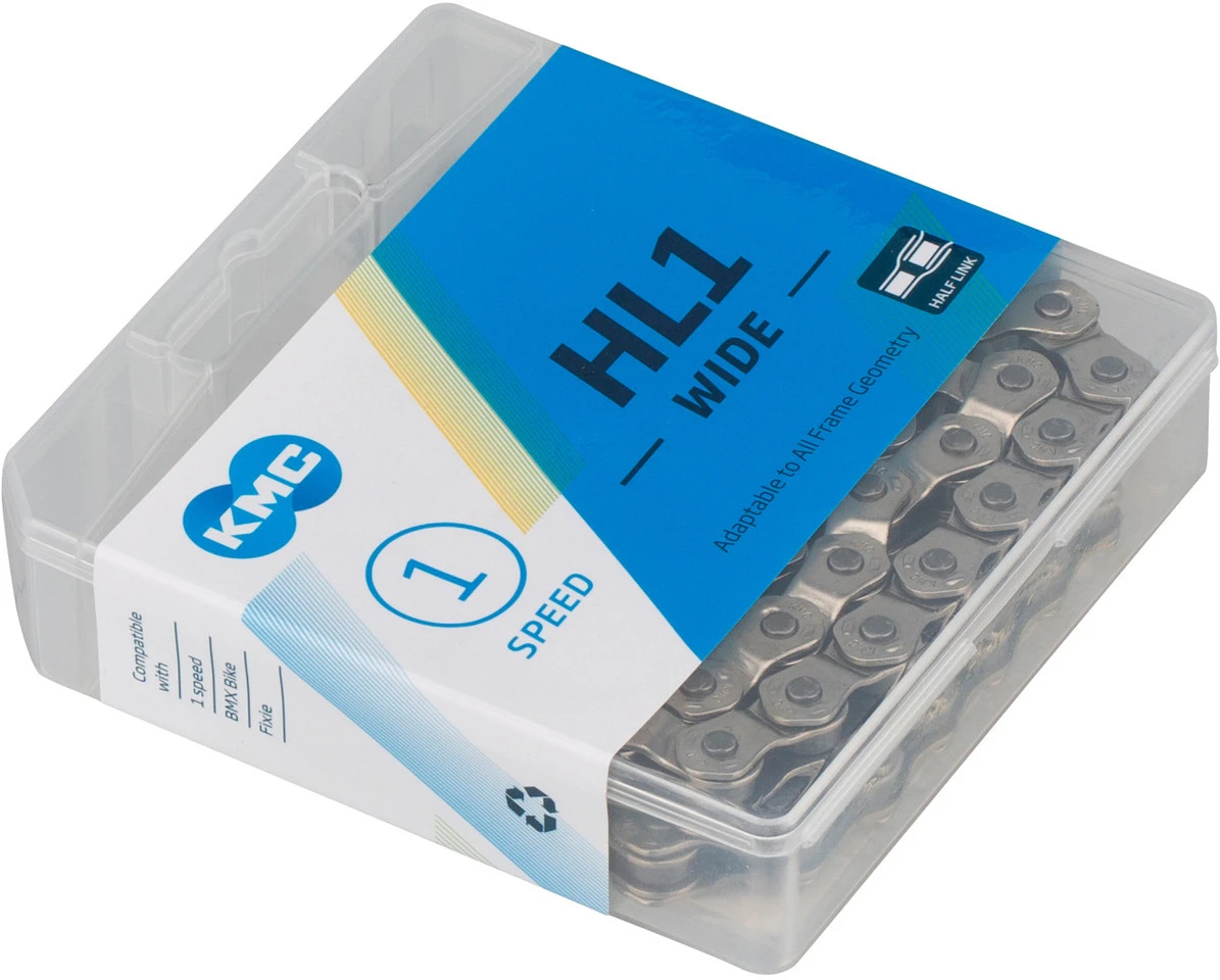 Die KMC HL1 Wide 1-fach Kette verfügt über eine Half-Link Konstruktion. Sie eignet sich perfekt für Nabenschaltungsräder, BMX Bikes, Fixed Gear Bikes, Bahnräder u. ä. In der Länge kann sie problemlos angepasst werden.