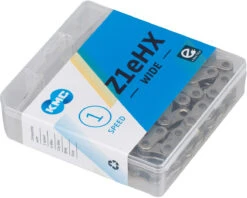 Die KMC Z1eHX Wide 1-fach Kette ist eine Heavy-Duty-Kette für besonders schwere Beanspruchung. Sie eignet sich damit perfekt für Räder mit Nabenschaltung, Fixies, E-Bikes, Bahnräder oder BMX Bikes. In dieser Version (silver) kommt die Z1eHX Wide mit einer Nickelbeschichtung.